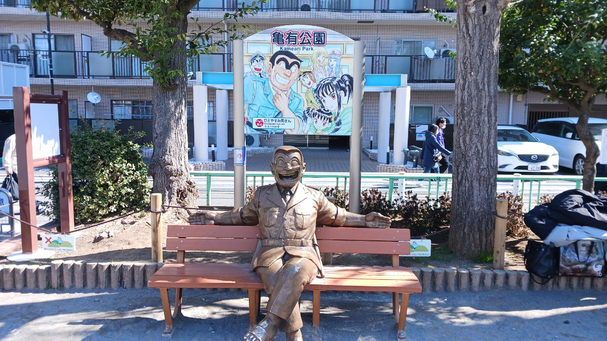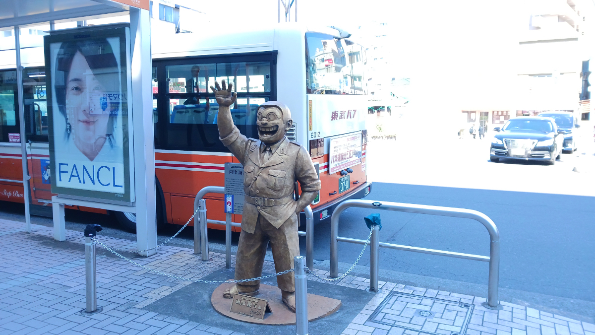 亀有に到着─。もはや説明するまでもないような気がしますが、ここ亀有は「こち亀」の街。あちこちに像が設置されています。観光客の方が像と一緒にツーショットを撮られていたりしたので、私も倣って東武バスと一緒に撮っておきました。