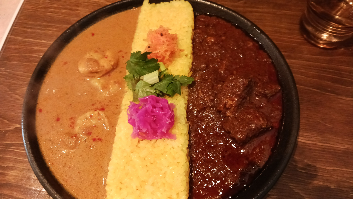 左側はエビがぷりぷりでルーにはココナッツが入っていてまろやかになっており、一方右側は豚肉がほろほろ、そしてだいぶスパイシーな味付けになっていまして、2つの味を贅沢に味わうことができ満足。東京に来る機会がある方にはぜひおすすめしたいです。