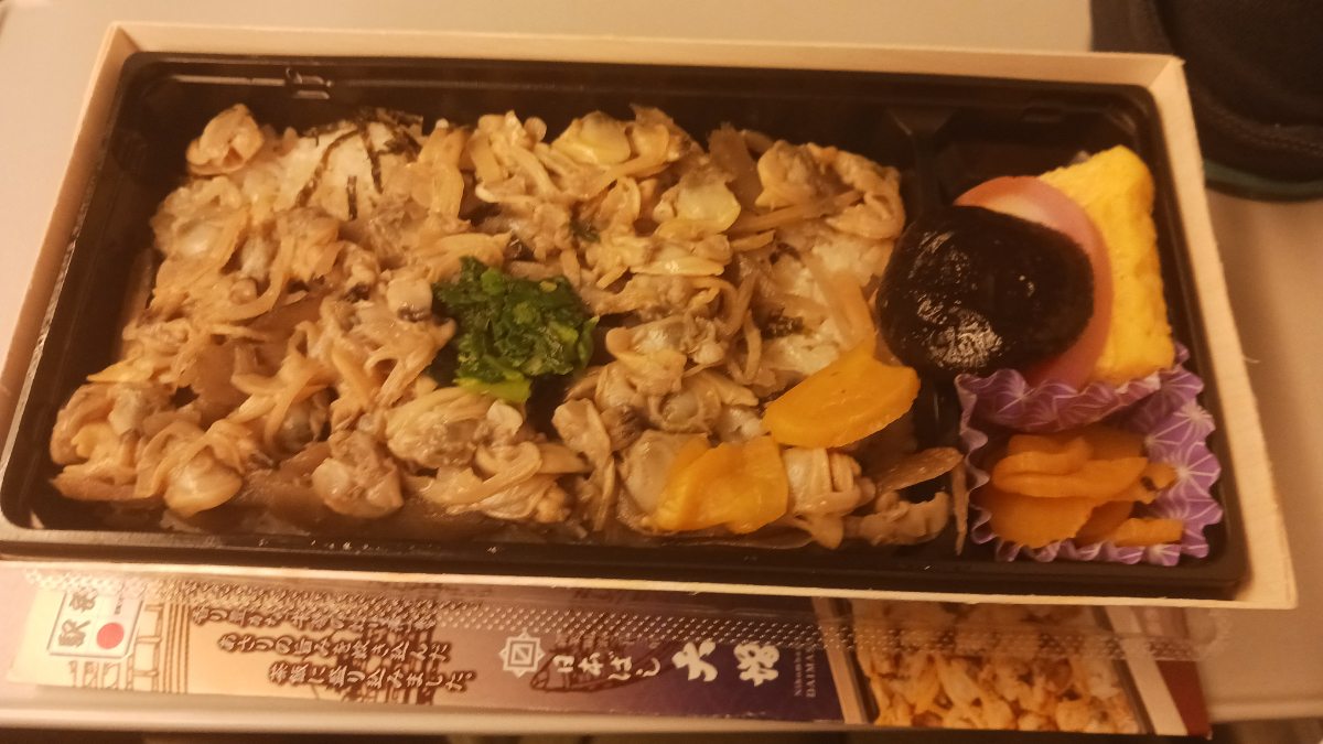 いただいたのは駅弁の中でもかなり有名な「深川めし」。和風な味付けでしみじみと美味しい。匂いがあまり気にならないのも良いですね。